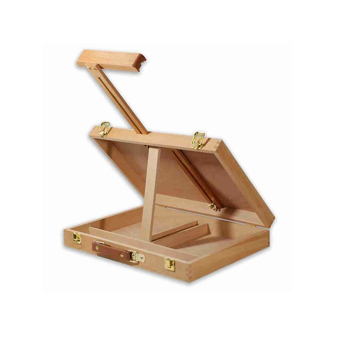Удобный настольный этюдник сочетает в себе функции мольберта и ящика для хранения кистей и красок. За счет того, что регулируется как верхний бегунок, так и нижняя планка, этот этюдник легко удерживает холсты больших размеров. Выполнен из бука, покрыт лаком.