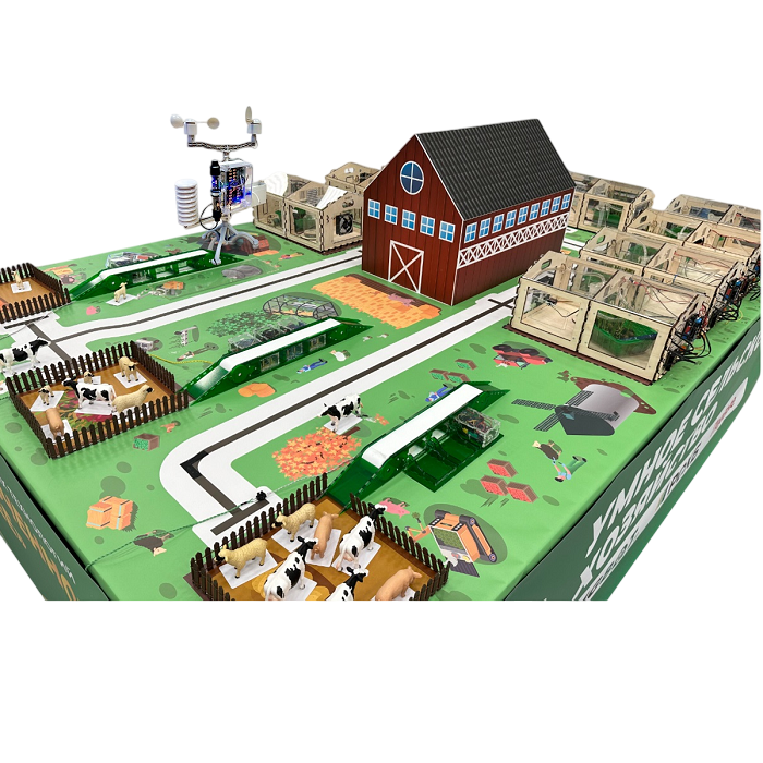 Учащиеся смогут собрать и запрограммировать систему, состоящую из умных теплиц, роботов-доставщиков, метеостанции, конвейеров для животных с RFID-сканерами и вспомогательных объектов.